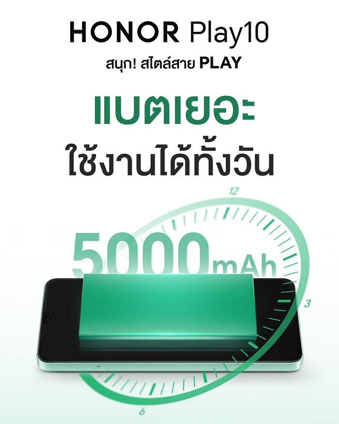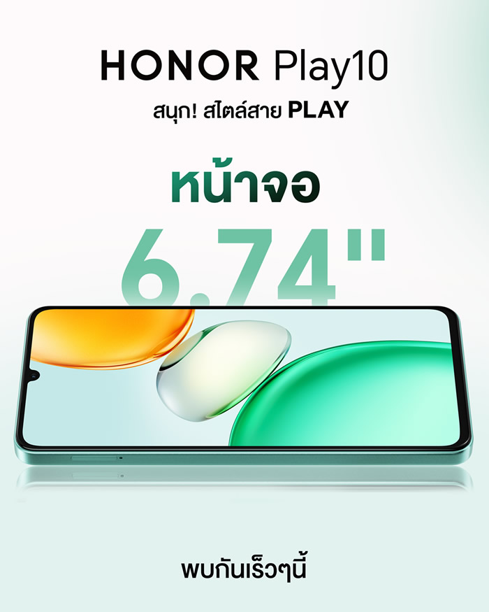 นอกจากนี้ HONOR ยังเตรียมเปิดตัวสมาร์ตโฟนอีกรุ่นที่น่าจับตามองอย่าง HONOR Play 10 มาพร้อม คอนเซ็ปต์ ‘สนุก สไตล์สายเพล์’ ซึ่งออกแบบมาเพื่อตอบโจทย์ผู้ใช้งานที่มองหาความคุ้มค่าและประสิทธิภาพการใช้งานในชีวิตประจำวัน โดดเด่นด้วยแบตเตอรี่ขนาดใหญ่ 5,000mAh ชาร์จไว 10W พร้อมหน้าจอขนาดใหญ่ 6.74 นิ้ว ให้ภาพคมชัดและลื่นไหลด้วย อัตรารีเฟรช 90Hz เพิ่มอรรถรสทั้งการรับชมคอนเทนต์และการใช้งานทั่วไป ด้านประสิทธิภาพ HONOR Play 10 มาพร้อมชิปเซ็ต MediaTek Helio G81 แบบ Octa-core ช่วยให้การประมวลผลเป็นไปอย่างรวดเร็วและเสถียร รองรับการใช้งานหลากหลายรูปแบบ ทั้งการสื่อสาร ความบันเทิง และการใช้งานในชีวิตประจำวันได้อย่างลงตัว