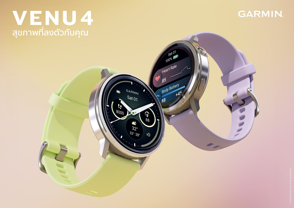 GARMIN เปิดตัว Venu 4 สมาร์ทวอทช์รุ่นใหม่ล่าสุดในตระกูล Venu โมเดลสุดฮิตของสายออกกำลังกายดูแลสุขภาพ จัดเต็มฟีเจอร์ด้านสุขภาพและการออกกำลังกายอย่างครบครัน ให้ผู้ใช้งานรู้จักและเข้าใจร่างกายของตนเองได้ดียิ่งกว่าที่เคย เสมือนมีโค้ชส่วนตัวที่พร้อมเข้าใจและคอยให้คำแนะนำเฉพาะบุคคลสำหรับผู้ใช้งานเพื่อพิชิตทุกเป้าหมายในการออกกำลังกายและการดูแลสุขภาพ โดย Venu 4 จะเป็นตัวช่วยสำคัญในการติดตามการนอน แนวโน้มสุขภาพและบันทึกไลฟ์สไตล์ประจำวัน เพื่อให้ผู้ใช้งานได้เห็นว่าไลฟ์สไตล์การใช้ชีวิตของตนเองนั้นส่งผลต่อสุขภาพโดยรวมอย่างไร Venu 4 มากับตัวเรือนโลหะดีไซน์ทันสมัย ลำโพงและไมโครโฟนในตัว พร้อมไฟฉาย LED ช่วยให้ผู้สวมใส่มองเห็นในที่มืดได้ชัดเจนยิ่งขึ้น และแบตเตอรี่อายุการใช้งานยาวนานสูงสุดถึง 12 วันในโหมดสมาร์ทวอทช์ หมดกังวลเรื่องการถอดชาร์จระหว่างคืน จึงสามารถติดตามข้อมูลสุขภาพได้อย่างต่อเนื่องตลอด 24 ชั่วโมง ทั้งคะแนนการนอนหลับ สถานะความแปรปรวนของอัตราการเต้นหัวใจ (HRV) รวมถึง Body Battery หรือระดับพลังงานของร่างกาย และข้อมูลสุขภาพที่สำคัญอื่นๆ อีกมากมายที่จะช่วยให้ผู้สวมใส่เห็นภาพรวมสุขภาพได้ครบถ้วนมากยิ่งขึ้น