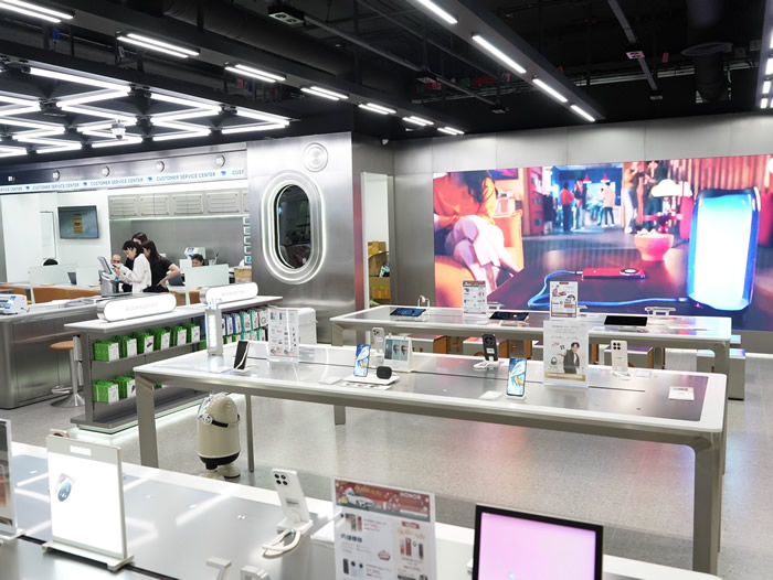 HONOR Authorized Service Center ได้รับการออกแบบภายใต้แนวคิด “The Coexistence of Technology and Humanity” หรือการอยู่ร่วมกันอย่างกลมกลืนระหว่างเทคโนโลยีและมนุษยธรรม โดยอ้างอิงมาตรฐานการออกแบบค้าปลีก HONOR SI 4.0 ที่มีความทันสมัยในระดับสากล ผสานกลิ่นอายของวัฒนธรรมท้องถิ่นอย่างมีเอกลักษณ์ โดดเด่นด้วยการตกแต่งที่ได้รับแรงบันดาลใจจากอาคาร คิง เพาเวอร์ มหานคร แลนด์มาร์คสำคัญของกรุงเทพมหานคร ถ่ายทอดผ่านเพดานไฟลวดลายเรขาคณิตที่สื่อถึงความล้ำสมัย ซึ่งภายในศูนย์บริการแบ่งพื้นที่ใช้งานอย่างเป็นสัดส่วน เพื่อรองรับประสบการณ์ของผู้ใช้งานในทุกมิติ ไม่ว่าจะเป็นพื้นที่รับรองลูกค้า เคาน์เตอร์บาร์ โซนสาธิตผลิตภัณฑ์ และพื้นที่กิจกรรม โดยออกแบบให้การเคลื่อนย้ายระหว่างโซนจัดแสดงสินค้าและโซนบริการหลังการขายเป็นไปอย่างต่อเนื่อง ไร้รอยต่อ สร้างบรรยากาศเรียบหรู ทันสมัย ด้วยวัสดุสแตนเลสและระบบ Dynamic Lighting ที่ช่วยเพิ่มมิติให้กับพื้นที่