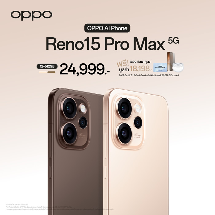 • สำหรับรุ่น OPPO Reno15 Pro Max 5G และ OPPO Reno15 Pro 5G จะได้รับ OPPO Enco Air4 มูลค่า 1,999 บาท