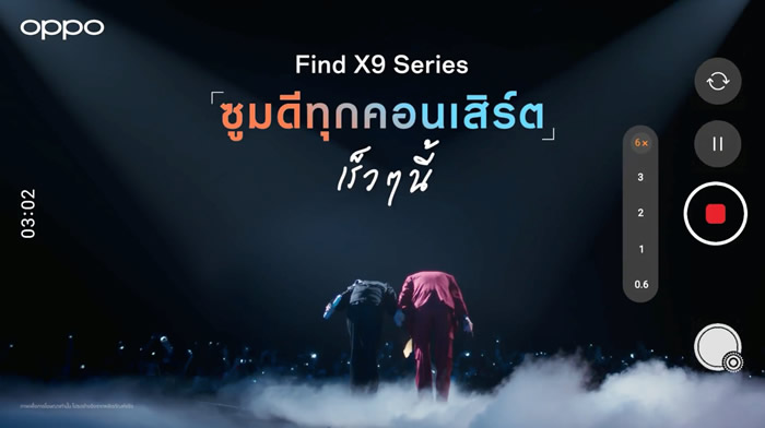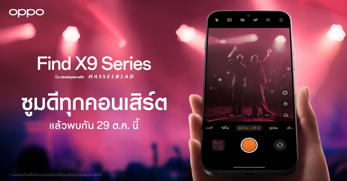 ออปโป้ ไทยแลนด์ ตอกย้ำประสบการณ์ใช้งานที่เหนือกว่า เตรียมส่งสมาร์ตโฟนแฟลกชิปที่สุดแห่งปี OPPO Find X9 Series สมาร์ตโฟนซูมดีทุกคอนเสิร์ต ด้วยการมาของกล้อง 200MP Hasselblad Telephoto คมชัดทุกการถ่ายภาพ ตอบโจทย์ทุกสายคอนเสิร์ต มาพร้อมดีไซน์ใหม่สะท้อนความพรีเมียมในทุกสัมผัส ด้วยขอบหน้าจอบางเฉียบ จับถือถนัดมือ พร้อมปล่อยวิดีโอตัวอย่างซูมคอนเสิร์ตด้วยกล้อง 200MP Hasselblad Telephoto และพลังซูมไกล 120x Super Zoom
