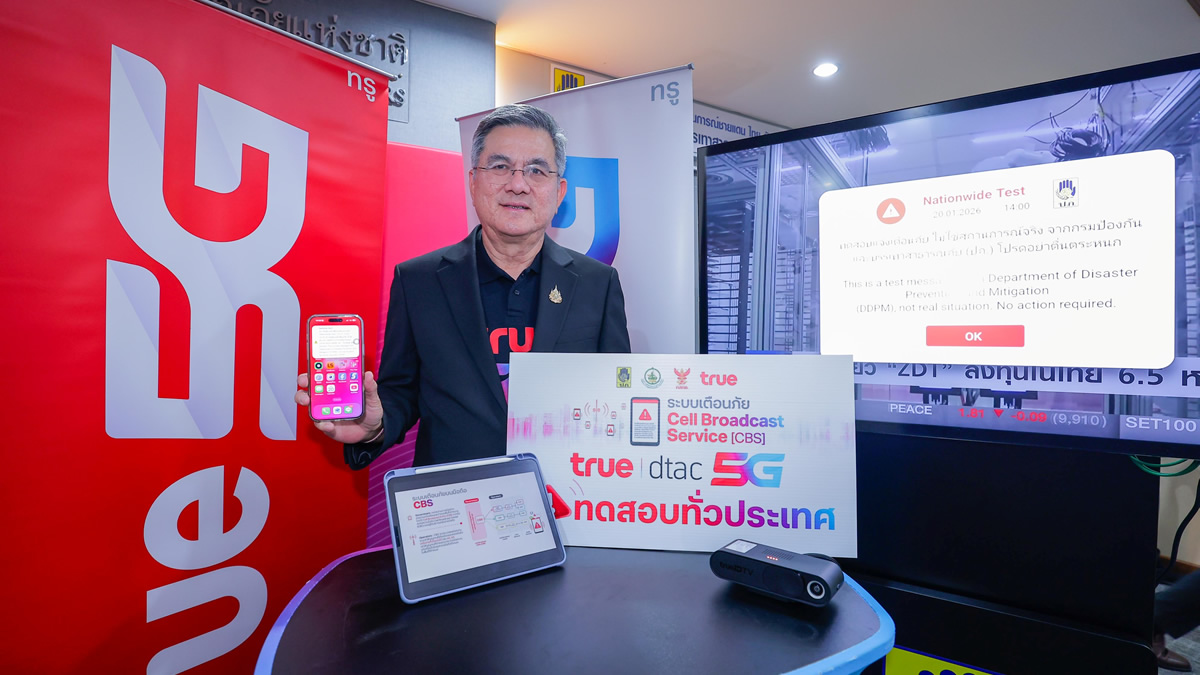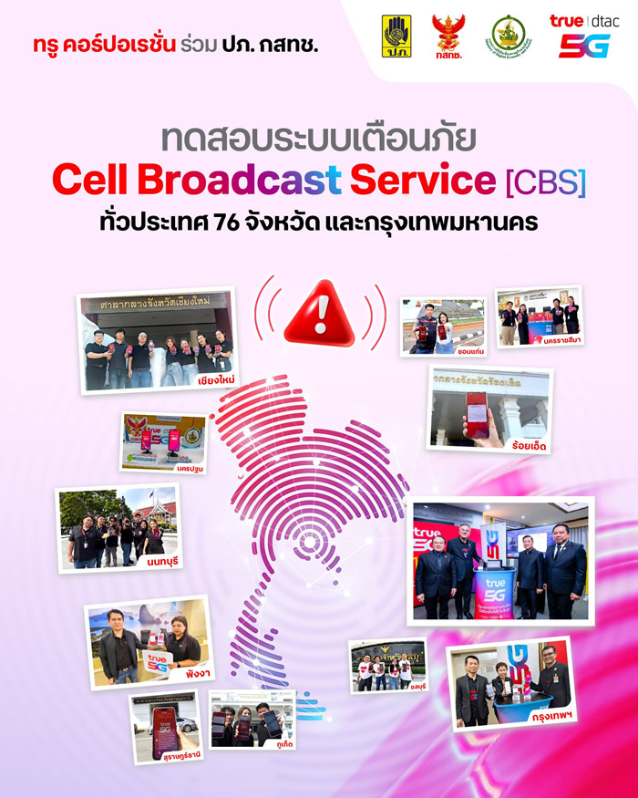 บริษัท ทรู คอร์ปอเรชั่น จำกัด (มหาชน) ร่วมกับ กรมป้องกันและบรรเทาสาธารณภัย (ปภ.) และสำนักงานคณะกรรมการกิจการกระจายเสียง กิจการโทรทัศน์และกิจการโทรคมนาคมแห่งชาติ (กสทช.) ประกาศความสำเร็จทดสอบระบบแจ้งเตือน “Cell Broadcast Service” ทั่วประเทศครั้งแรกของไทย ยืนยันศักยภาพของระบบที่สามารถส่งข้อความแจ้งเตือนภัยไปยังโทรศัพท์มือถือของประชาชนครอบคลุมทั่วประเทศทั้ง 76 จังหวัดและกรุงเทพมหานคร พร้อมยกระดับการเตือนภัยไปอีกขั้นผ่านหน้าจอโทรทัศน์สำหรับผู้ชมผ่านกล่องทรูไอดีทีวี ตอบโจทย์การเข้าถึงประชาชนได้ครบทุกกลุ่มเป้าหมาย สะท้อนศักยภาพของเทคโนโลยีการสื่อสารที่พร้อมรองรับสถานการณ์ฉุกเฉินจริง เพื่อเสริมสร้างคุณภาพชีวิตและความปลอดภัยของคนไทยทุกคน