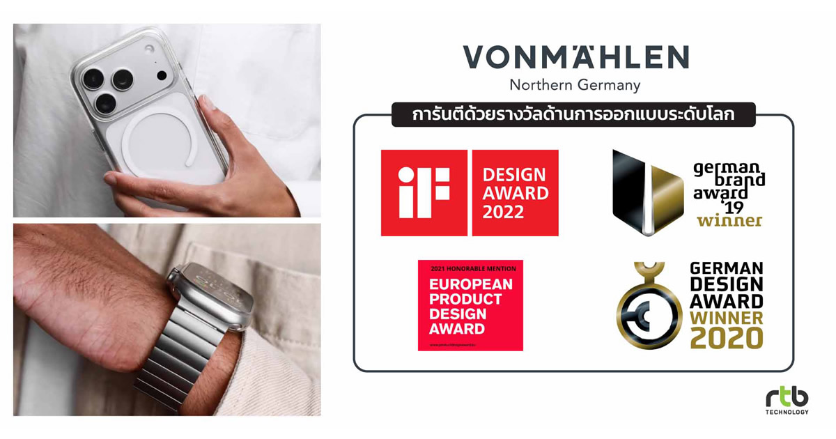 บริษัท อาร์ทีบี เทคโนโลยี จำกัด ตอกย้ำความเป็นผู้นำด้านการจัดจำหน่ายสินค้าไอทีและแกดเจ็ตในประเทศไทย เดินหน้ารุกตลาดอุปกรณ์เสริมสมาร์ทดีไวซ์อย่างต่อเนื่อง ด้วยการเปิดตัวไลน์อัปผลิตภัณฑ์ใหม่จากแบรนด์ VONMÄHLEN (ฟอนแมเล่น) ที่ครอบคลุมทั้งเคสและสายสำหรับ Apple Watch และ iPhone 17 Series โดยชูจุดเด่นด้านดีไซน์พรีเมียม ฟังก์ชันการใช้งานที่ตอบโจทย์ชีวิตประจำวัน และการเลือกใช้วัสดุที่เป็นมิตรต่อสิ่งแวดล้อม เพื่อตอบรับเทรนด์ผู้บริโภคยุคใหม่ที่มองหาอุปกรณ์เสริมที่มากกว่าการปกป้อง แต่ยังสะท้อนตัวตนและไลฟ์สไตล์ได้อย่างชัดเจน พร้อมยกระดับประสบการณ์การใช้งานสมาร์ทดีไวซ์ให้ครบจบในทุกมิติ