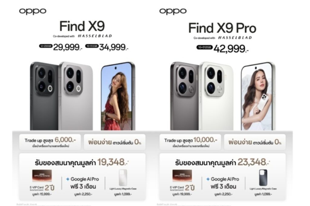OPPO Find X9 Pro มาพร้อมตัวเลือก 2 สี ได้แก่ สีขาว Silk White และสีเทา Titanium Charcoal วางจำหน่ายในรุ่นความจุ RAM 16GB + ROM 512GB ราคา 42,999 บาท