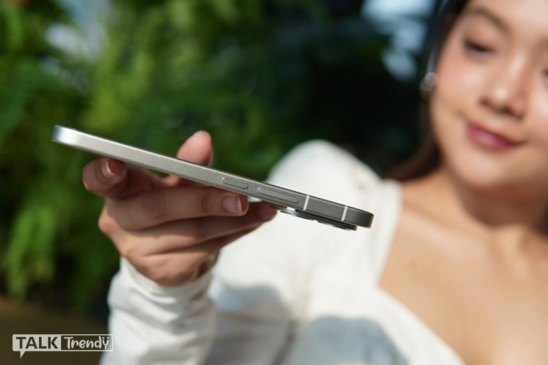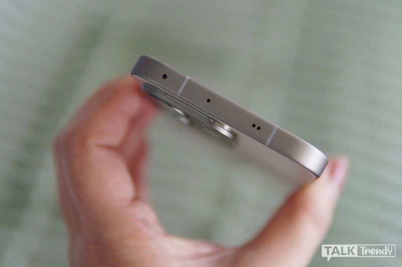 ขอบข้างที่เป็นอะลูมิเนียมมีความเรียบเนียนจับถือสบายมือ โดยตัวเครื่องด้านขวาจะมีเพียงปุ่มเพิ่ม-ลดเสียง และปุ่มเปิด-ปิดเครื่อง