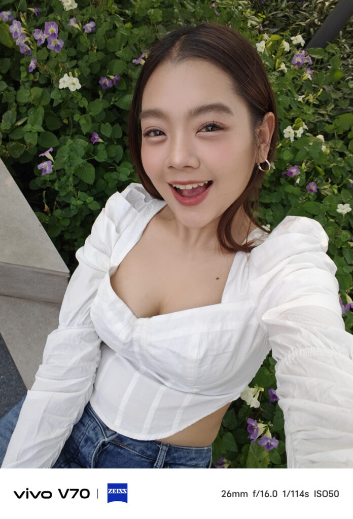 กล้องหน้า vivo V70 มาพร้อมความละเอียดสูง 50MP ZEISS Group Selfie มุมกว้าง 92 องศา สามารถถ่ายภาพได้ทั้งมุมกว้างและมุมปกติ รองรับออโต้โฟกัส มี AI Facial Contouring ช่วยปรับรูปหน้าให้สวยงาม และ AI Professional Portrait ช่วยปรับสีผิวบนใบหน้าให้มีความเป็นธรรมชาติ ได้ภาพเซลฟี่สวยแค่แชะเดียว